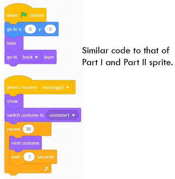The author uses two sprites Part I and Part II to draw a dragon. I don’t know why the author separates the drawing dragon code into two sprites. Actually the costumes of the two sprites can be combined. Maybe the author feels that there are too many costumes in one sprite (Part I sprite has 107 costumes, and Part 2 sprite has 68 costumes).