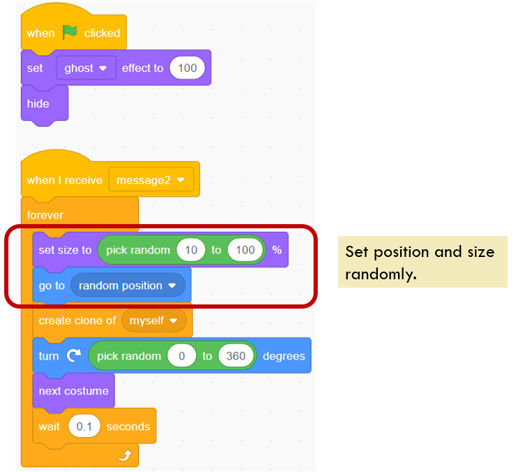 In terms of Code, this project has not complicated design. The code is straightforward and easy to understand. What impressed me is that the author designs 175 costumes for the dragon and 40 costumes for the forest backdrop, starting from the first stroke to the final arts work.