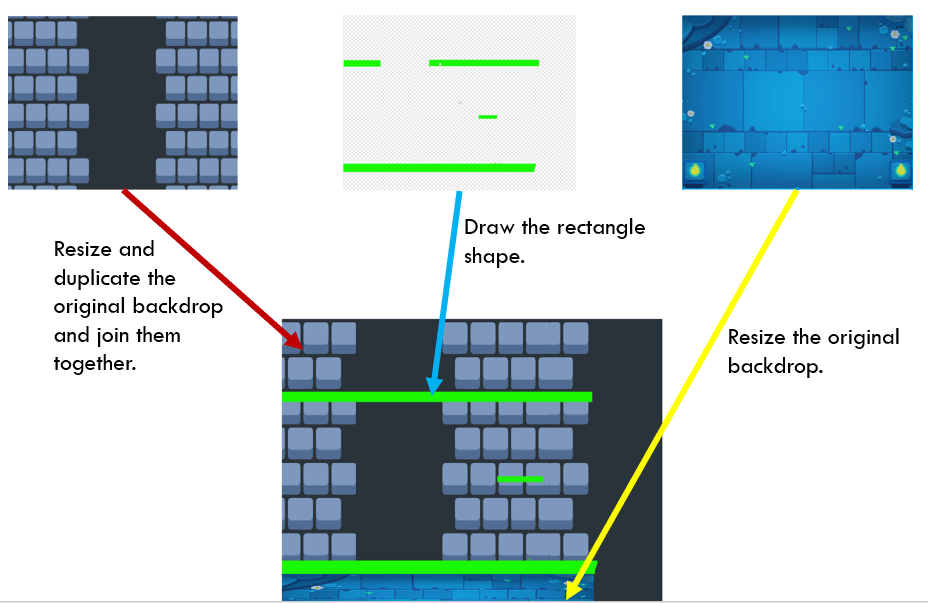 Game backdrop is static here. Since it is my son’s first independent project, he simplified the design of backdrop. The backdrop is fixed, without rolling horizontally or vertically. If the backdrop can move according to sprite’s moving direction, the game needs to use another method to control the rolling backdrop, which is more complicated. If you are interested, you could refer to an excellent example of implementing this method in a game “super mario”. I have a post (link is here) to introduce its design.