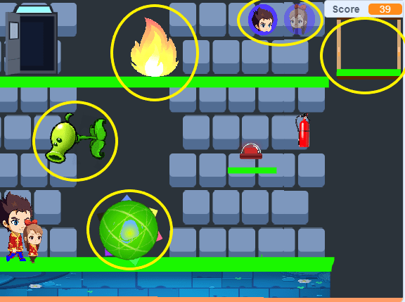 This is a typical platform game. the main sprites are Xiaoming the boy and Meiwen the girl. They need to avoid the bullets from bullet shooter, pick up the extinguisher, ride on the elevator to the 2nd floor and put out the fire before they could enter into the exit to finish the game successfully.