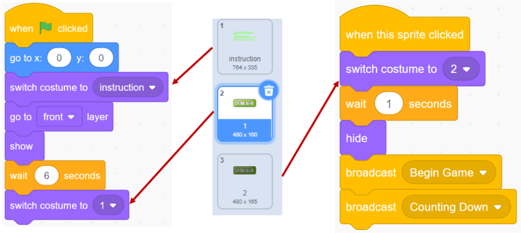 “Begin Game” sprite will show up against the rolling night sky. This sprite has three costumes. The first is a paragraph of text introducing how to play the game. The second costume is a “Begin Game” button shape. When the player clicks the button, the sprite will switch to the third costume, which is the same as the 2nd costume except a darker tone representing the pressing-down status of the button.