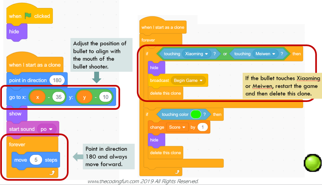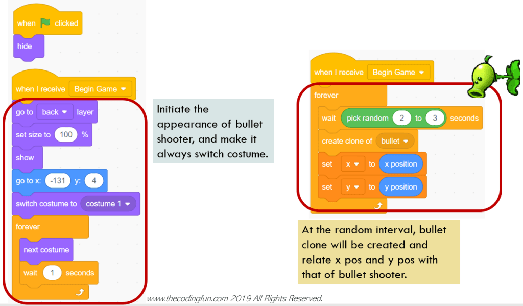 Bullet shooter will shoot out bullets at a random interval. It creates clone of bullet, and then let bullet go to a start-off position where the mouth of bullet shooter is located.