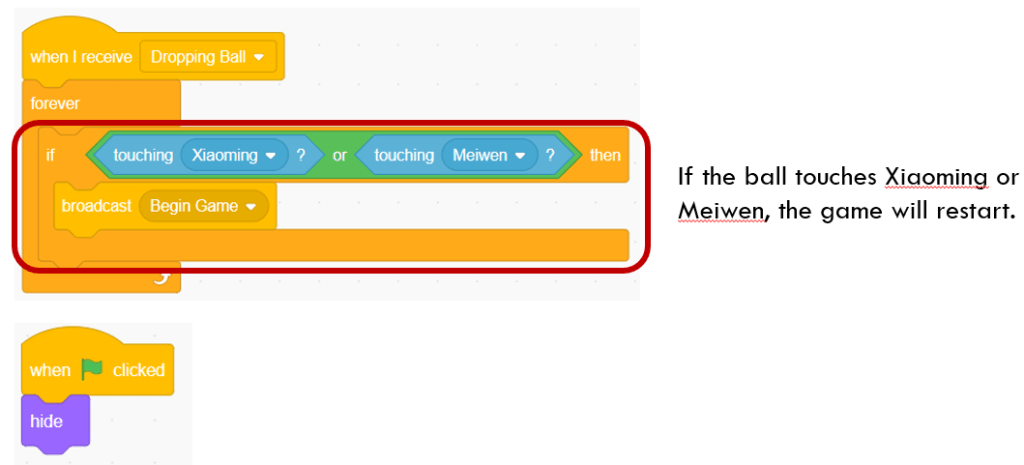 In another code segment, the code will always monitor if the giant ball touches Xiaoming or Meiwen. If it does, restart the game.