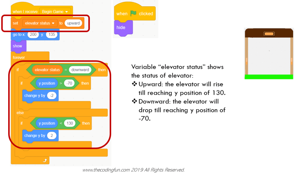 The elevator is an interesting sprite. The designer created a variable called “elevator status” to show the upward/downward status of elevator. The variable is a global one, so each sprite can see and use it. Later on, when I analyze the code of the main characters Xiaoming and Meiwen, you will notice that they also need to use the variable “elevator status”.