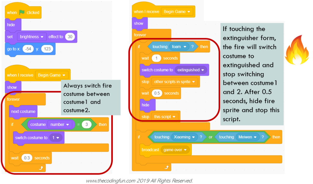 Fire sprite is another obstacle in this game. There are three costumes. The first two costumes are flame shapes, animating the dancing of flame. When extinguisher foam touches the flame, the file sprite changes into extinguished costume and then disappears. After that, all of code segments for the fire sprite will stop running.