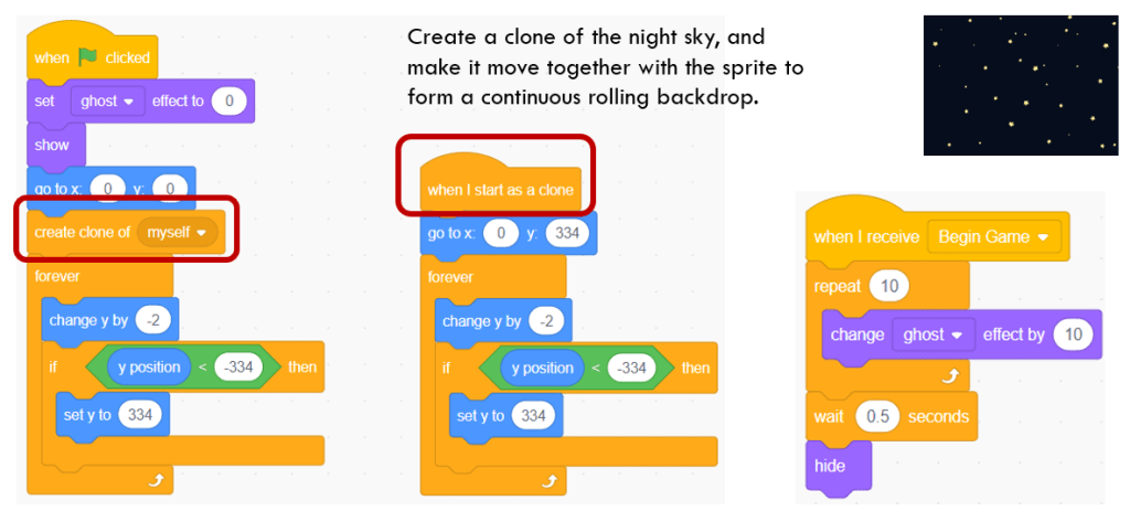 Although my son did not design the rolling backdrop for the game, he did design a rolling night sky for the introduction page. It will show up at the beginning of the game. He used one image to cover the whole stage and then created clone for this image. He made the two images move at the same speed to form a continuous rolling backdrop.