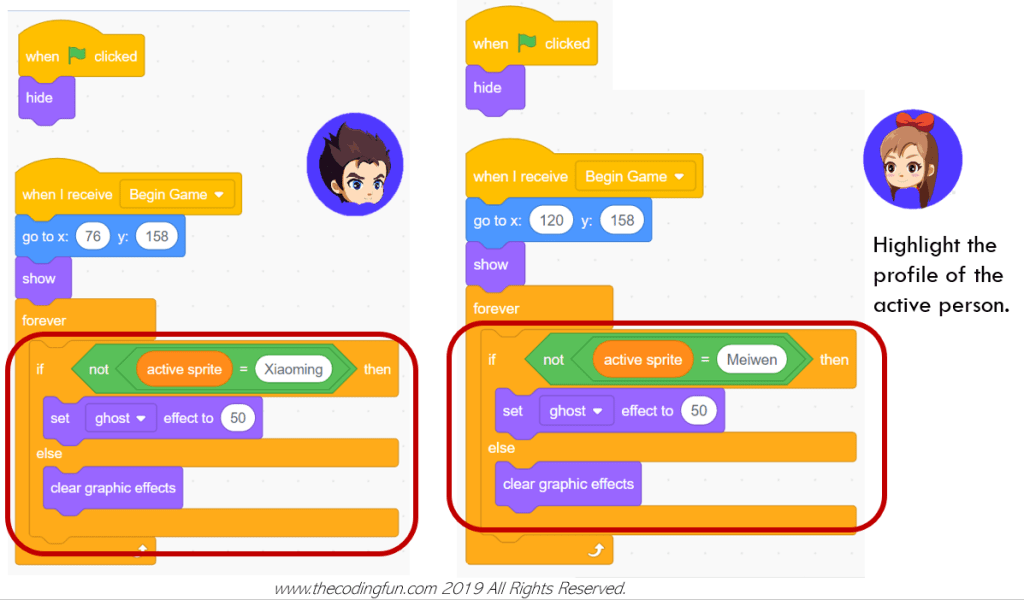 Till now, I have analyzed the code for several sprites, but… the most important actors Xiaoming and Meiwen have yet been introduced. Let’s have a break and read their code in the post of Part II.