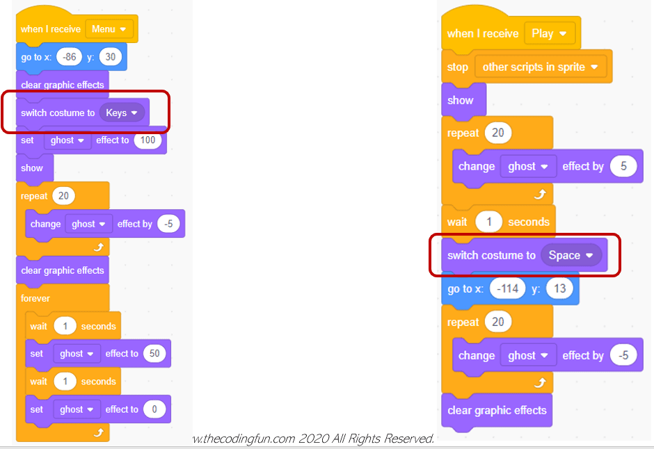 “When I receive Menu” block defines the behavior of the Key Sprite at the menu selection stage.