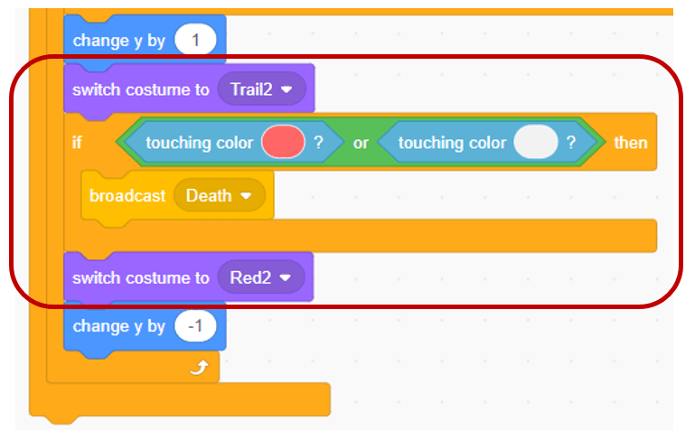 In part 3, I notice that before verifying death status, the sprite switches its costume to “Trail2”, and then switches back to Red2 costume after verification. Since the program runs very fast, our eyes actually could not catch the switching of the costumes. So is it necessary to switch costumes? Yes, let me explain why it is.