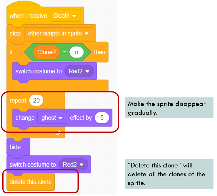 when the Player sprite receives death message, the player cube will fade away gradually by using ghost effect. After that, it will delete this clone. Please note that since “delete this clone” block is put outside of “When I start as a clone”, calling this block will delete all of clones of this sprite.