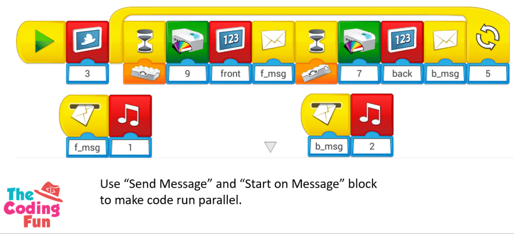 In the above example, if put Play Sound block into the same coding string as the other blocks, the program will pause at Play Sound block until the music finishes playing, thus it blocks the program from executing the following blocks. When there are Play Sound block and other blocks needing to run simultaneously, the best way is to put Play Sound block in a parallel execution segment by using “Send Message” and “Start by Receiving Message” block.