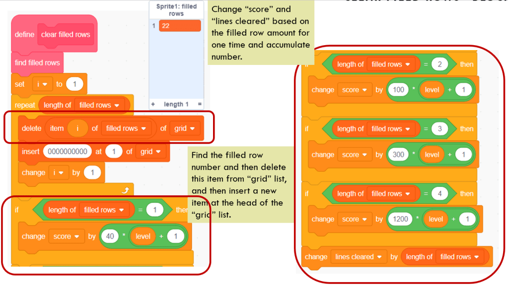 This block deletes the filled row(s) from “grid” list. Each time it deletes one row, it inserts an empty row at the head of “grid” list, so that “grid” list will always keep its 22 rows. Please note that the new empty row should be inserted at the row 1, instead of at the original position of the deleted row.