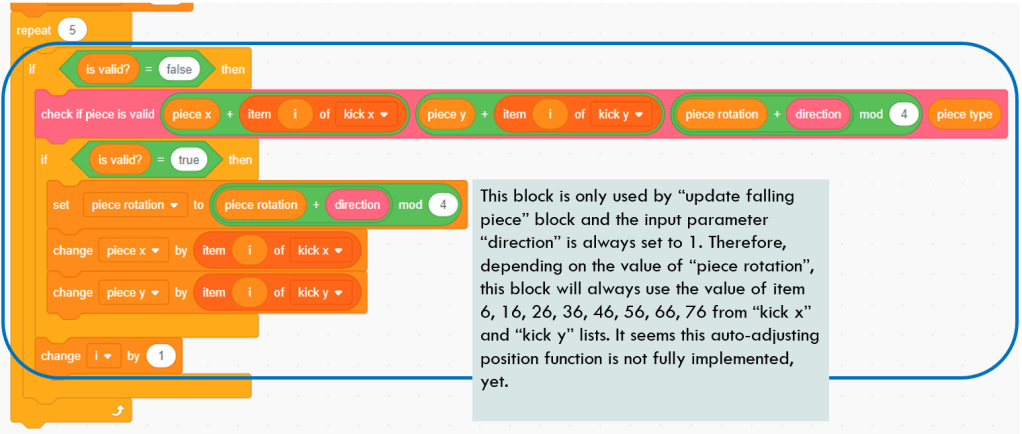 After reading the code carefully, I assume that the code designer tries to introduce an auto-adjusting mechanism. When the program rotates the falling piece, it will first check if the rotation is valid or not by calling “check if piece is valid” block. If the rotation will not interfere with the existing pieces, it is valid and “is valid?” variable is set to true. The program will update “piece rotation” and then exit the loop (the loop will repeat 5 times when “is valid?” is False).