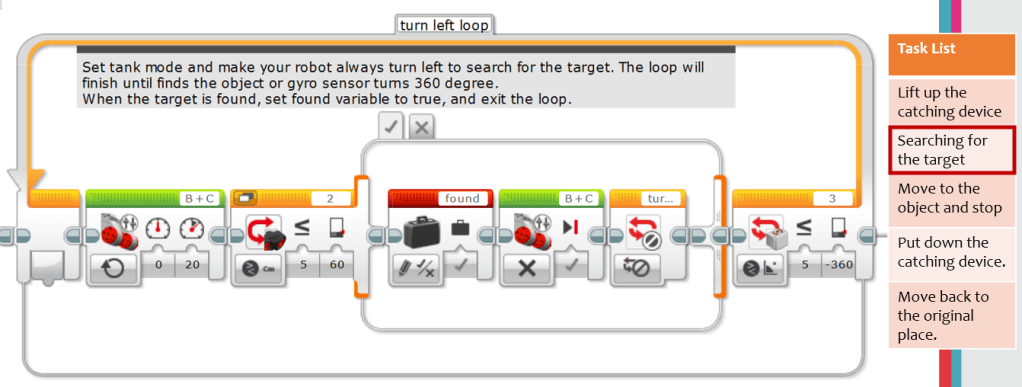 When searching for the target, the program sets left motor power to 0 and right motor power to 20. In this way, the robot always turns left. If the ultrasonic sensor identifies any object within a distance of 60 centimeters (you can change this range), the program will set “found” variable to True, stop the motors and end the loop. However, if the robot has turned 1 round but not yet finds any target, the loop also finishes but the variable “found” is kept as False.