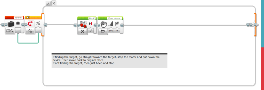 For this segment, the program checks the value of variable “found” first. If the target is found, the robot will move to the target. Since the program assume that the robot has made adjustment and faced the target straight, it will use tank mode and set same power to both left and right motors. How long