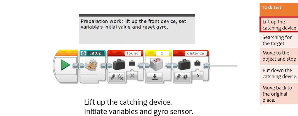 At the beginning of the program, I use a “Lift Up” block to lift up the front attachment. The code in this self-designed block is simple and easy to understand. It drives the medium motor to turn until touch sensor is pressed down by the bar. I also initiate variables “found” and “distance”, and reset gyro sensor.