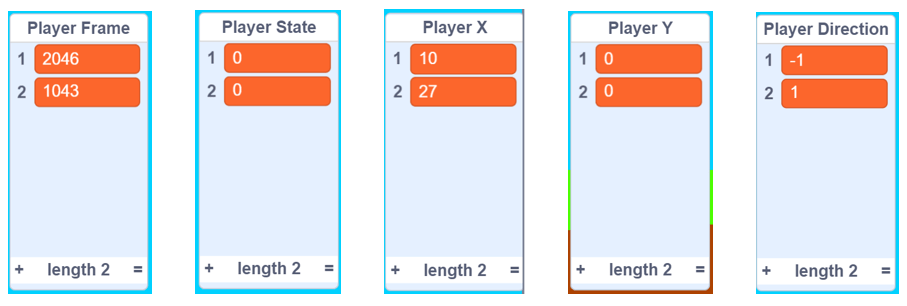 Please also note that in this segment, cloned player’s position, direction and costume setting are wrapped in a Forever block, which means that those values keep synchronized with item values of Player X, Player Y, Player Direction, Player State and Player Frame lists continuously.