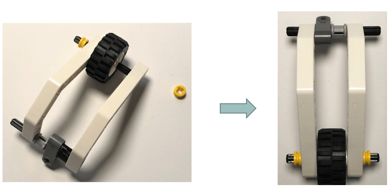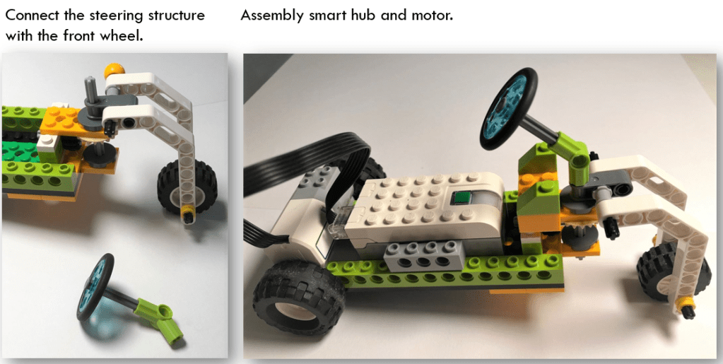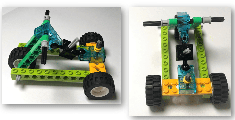 Front wheel structure is the most important part of the tricycle. Since LEGO WEDO 2.0 has not angled beam which contains axis hole, we borrowed two white angled beams from LEGO MindStorms EV3 and a perpendicular axis joiner. The three components are external to LEGO WEDO 2.0.