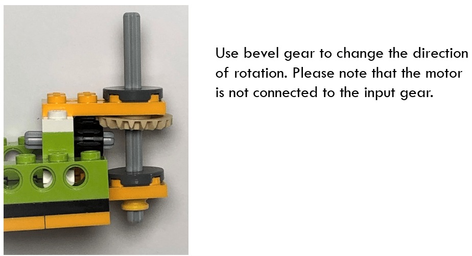 We use a bevel gear to change the drive direction from horizontal to vertical. Please note that in this model, we do not connect any motor to the input gear. The only motor in LEGO WEDO 2.0 will be used to drive the rear wheels forward. If you have another spare model, you could use it to drive the input gear, so the steering could be controlled by program, rather than manually.