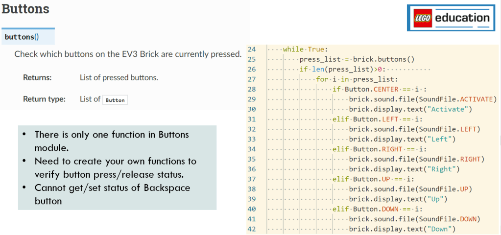 In EV3Dev Python, buttons module realizes all of the functions in the original LEGO Block language. Meanwhile, it provides function to check the status of backspace button, which is not supported in LEGO Block language.
