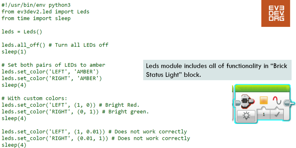 The Brick Button Light block in LEGO Block is renamed as Leds module in EV3DEv Python. It can set multiple colors, and also offer some predefined lighting patterns, such as police lights, circle lights and flash lights. Although those functions can be realized by users themselves, they really make the light setting a breeze.