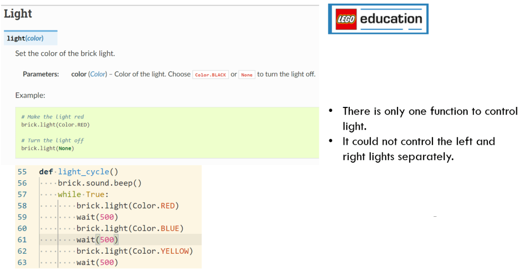 Again, let’s see EV3 MicroPython. This module is named as “Light” and it provides only one function called brick.light(). It could set the light to different colors or set it to NONE to turn the light off. Except this, it could not get the light color or set color separately.