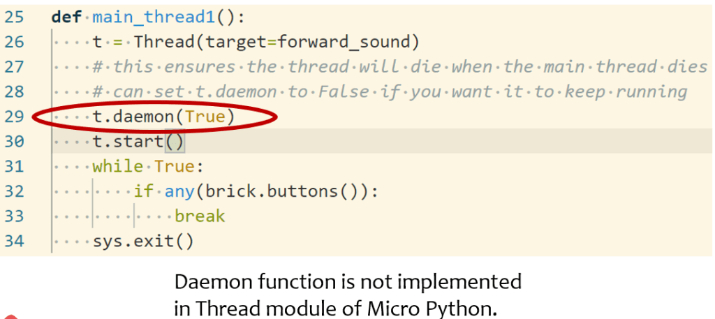 However, please note that threading functionality in Micro Python is not fully implemented, as mentioned in the following documentation. For example, in the standard Python, thread.daemon(True) could kill the thread when main thread dies. However this method “thread.daemon()” is not implemented by Micro Python, yet.