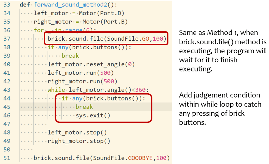 In another method “main_thread1()”, it creates a thread for the method “forward_sound()” and start that thread. After that, it uses a while loop to check the status of brick buttons. If any brick button is pressed, the main thread will call “sys.exit()” to exit the program. Done!