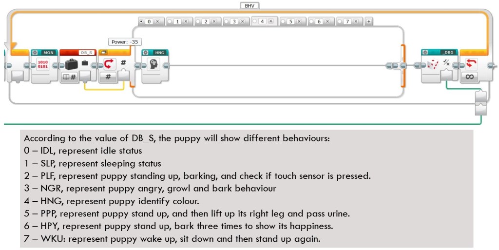 The execution of block is determined by the value of variable “DB_S”. The value of “DB_S” is not increased or decreased continuously but will be changed in the behavior blocks. Therefore, one behavior of puppy will influence the subsequent behavior. In another word, those behavior blocks are not totally independent, making the analysis especially difficult.