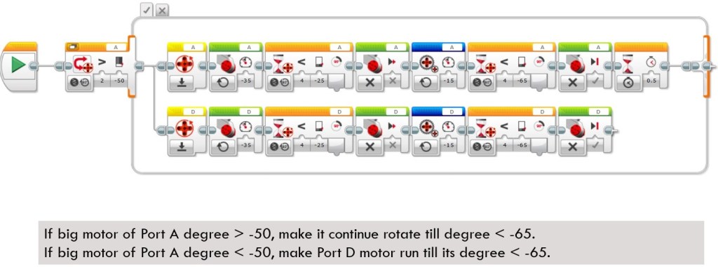 This block is supposed to make the rear legs of the puppy stand up. It does not use Move Tank block since in practice, this method could not make the legs stand up successfully each time. The reason might be that the body is too heavy, so sometimes the torque exceeds the load of the motor. To overcome this problem, this block simulates the Move Tank block by using parallel code. Each motor calls Big Motor block to run a small degree of 25 and then switches to use Unregulated Motor block to run another 35 degrees.
