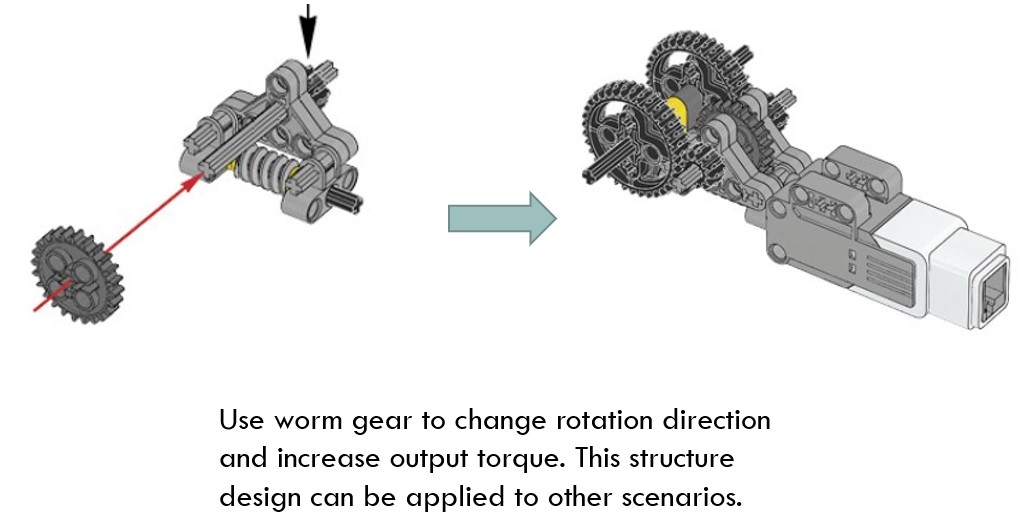 Pay attention to the assembly structure of the worm gear and see how it uses various connectors to assembly the worms and gears together. Such a structure could be used in many other scenarios.