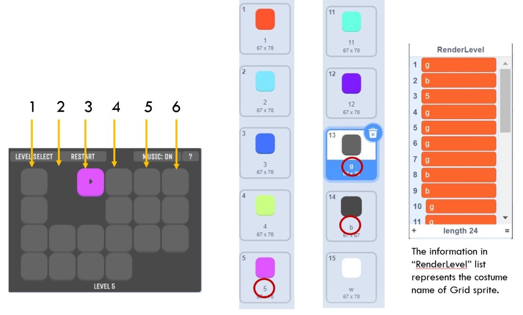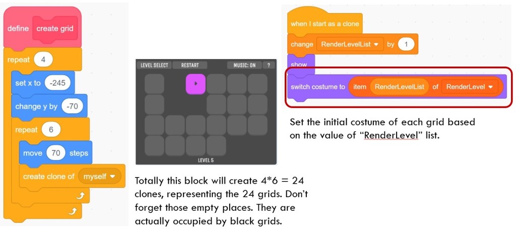 In the “create grid” block, the program creates 24 clones of grid sprite and sets the costume of each grid clone based on the value of “RenderLevel” list.