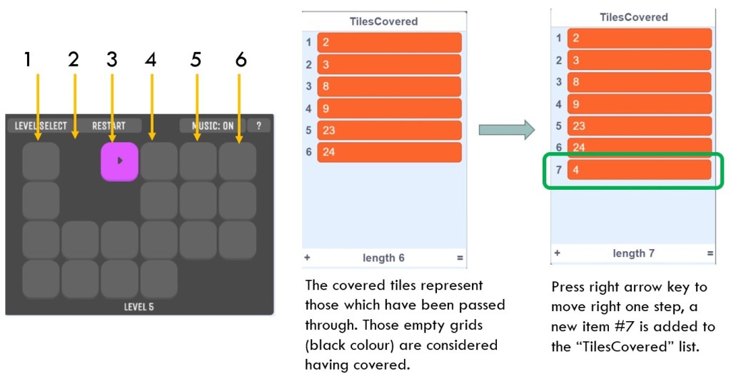 Still take the example of Level 5. The initial list of “TilesCovered” contains 6 items, representing the index of grids which are in black or in cyan color.