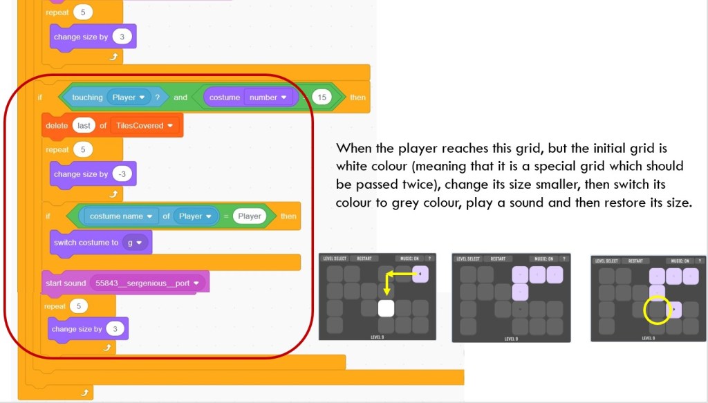 The code segment will also consider the white grids which are required to pass twice. When the grid clone touches the player and the grid color is white, the grid clone will change color to grey, and meanwhile, mark itself as unoccupied in the “TilesCovered” list. In this way, it is just like other uncovered grid clone to wait for passing in the following steps.