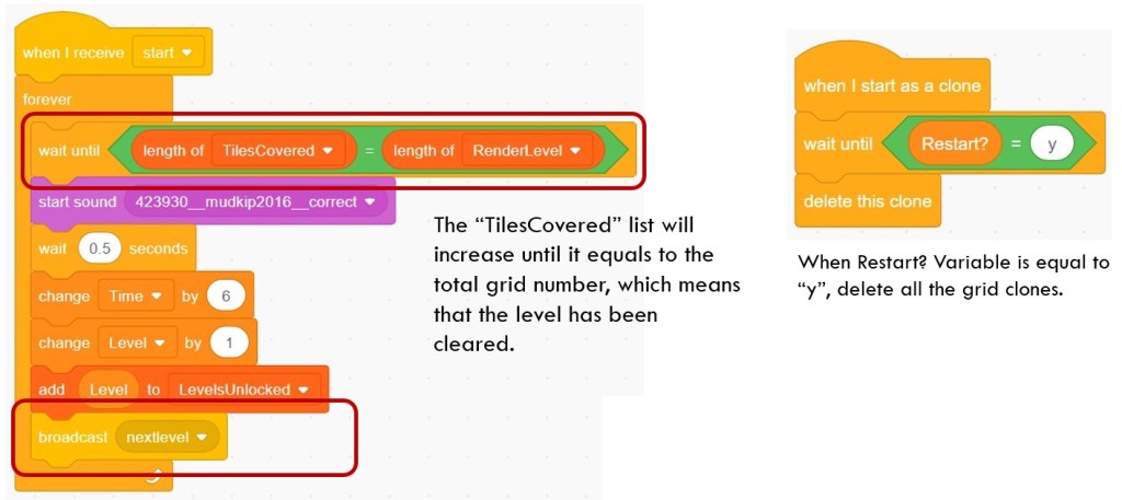The message of “start” is broadcast by Levels sprite. When Grids sprite receives this message, It will wait until the length of TilesCovered and RenderLevel lists becomes the same. As mentioned above, RenderLevel list is always 24 in length once it is constructed, but length of TilesCovered list changes. When length of TilesCovered list reaches 24, meaning that all the grids have been covered and this level is cleared. The program will then play a sound, level up and then broadcast “nextlevel” message, so that a new level’s grid matrix will begin constructing.