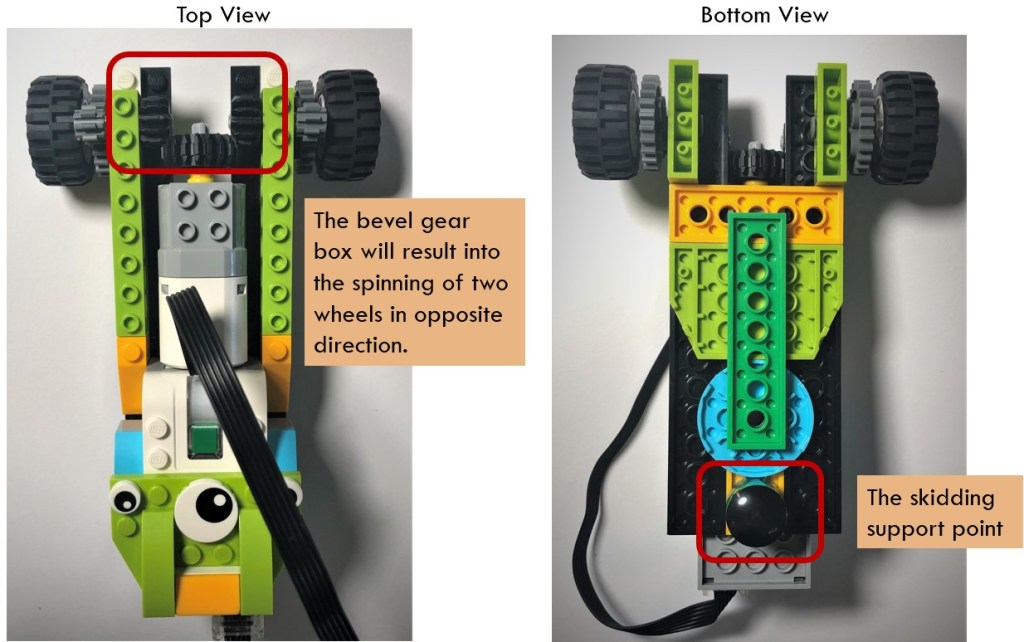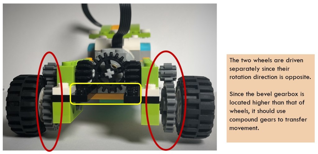 Since the vehicle structure is simple, I will not present step-by-step instruction for the model. From the top view, we could see that the bevel gearbox structure is realized by three bevel gears. The input gear is put in the middle and connects to the motor via axis. It should mesh precisely with the two output gears.