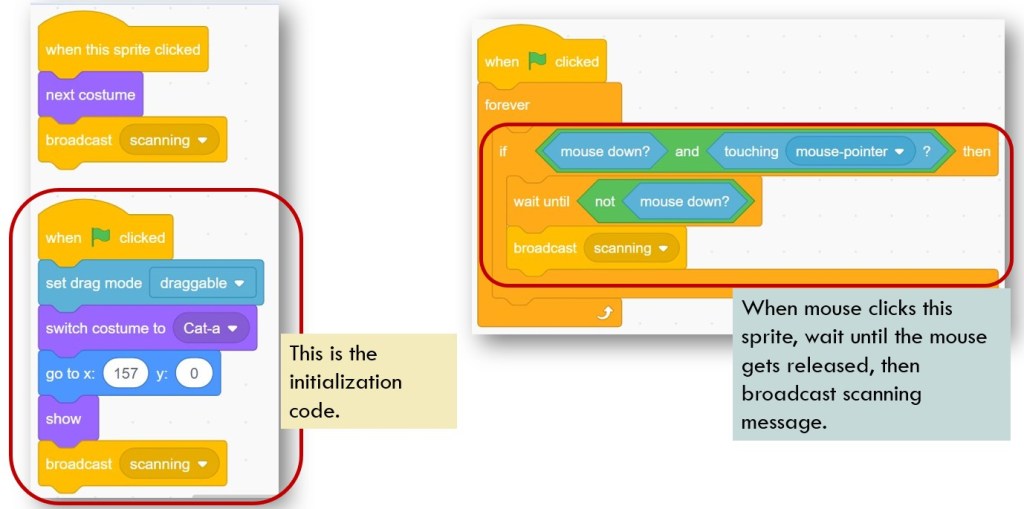 The Scanner sprite is responsible for scanning the Scratch Cat sprite and stores its silhouette information in a Scanner list. The key issue in the original project is that it creates multiple clones to mark the scanned position, but does not delete the clones in time. The program could not work properly when too many clones exist simultaneously, which might be due to the memory limitation of the program. I guess that is why the author only sets a 10*10 scanning grid. When exceeding this precision, the scanner clones just could not work.