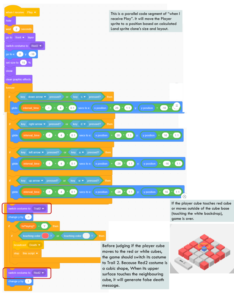 This code segment handles the behavior of Player sprite when the game enters into Play stage. It continuously monitors the key pressing behavior and checks if the Player sprite touches red or white color. Touching red color represents that the Player sprite moves onto the “burning” cube and invokes “Dead” message, while touching white color represents that the Player sprite moves out of the cube boundary, which would also end the game.