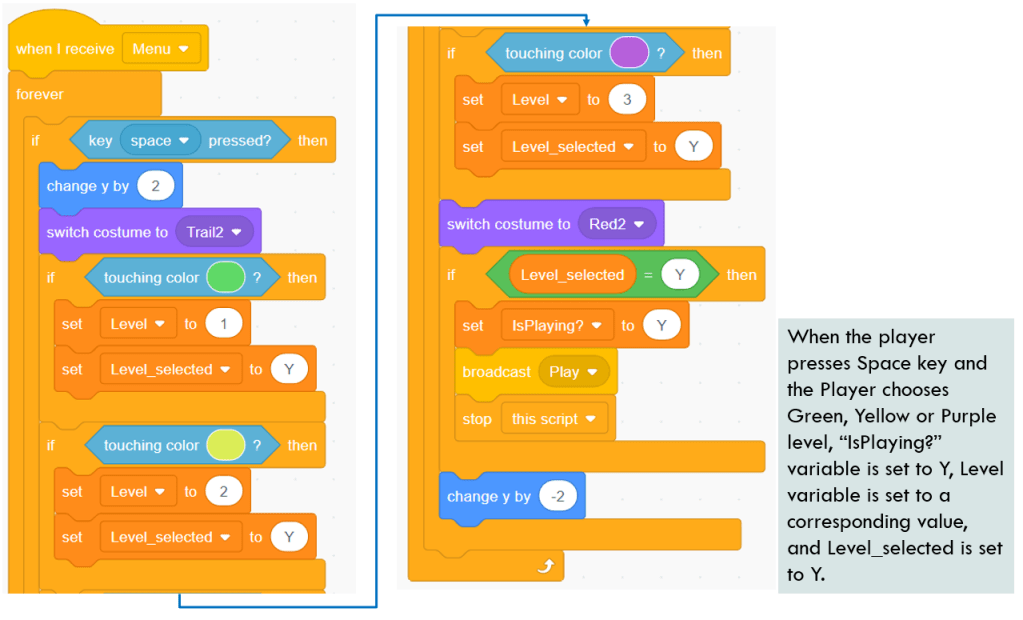There are two code segments of “when I receive Menu”. One of them is used to monitor the pressing of Space key. When that key is pressed, and Player sprite touches Green, Yellow or Purple color, a game level is selected. The program will then broadcast “Play” message. At the end of this code segment, it uses “stop this script” to stop the monitoring of Space key when entering into Play stage.