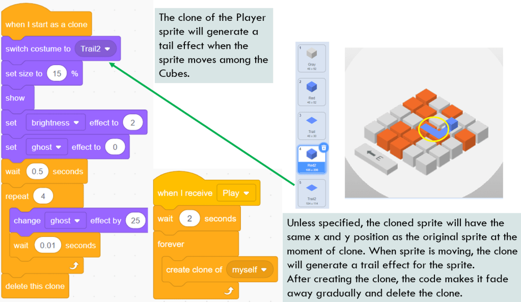 Like Land sprite, the Player sprite also needs to create clone. If you play this game, you would notice the trails following the Player sprite, as circled in the below diagram. The trails actually are clones of Player sprite. Different from Player sprite itself, the clones use the “Trail2” costume which is a 2-D flat image and then change ghost effect till finally disappear. The final effect is a tail which shows the path of the Player sprite but fades away in a short time.