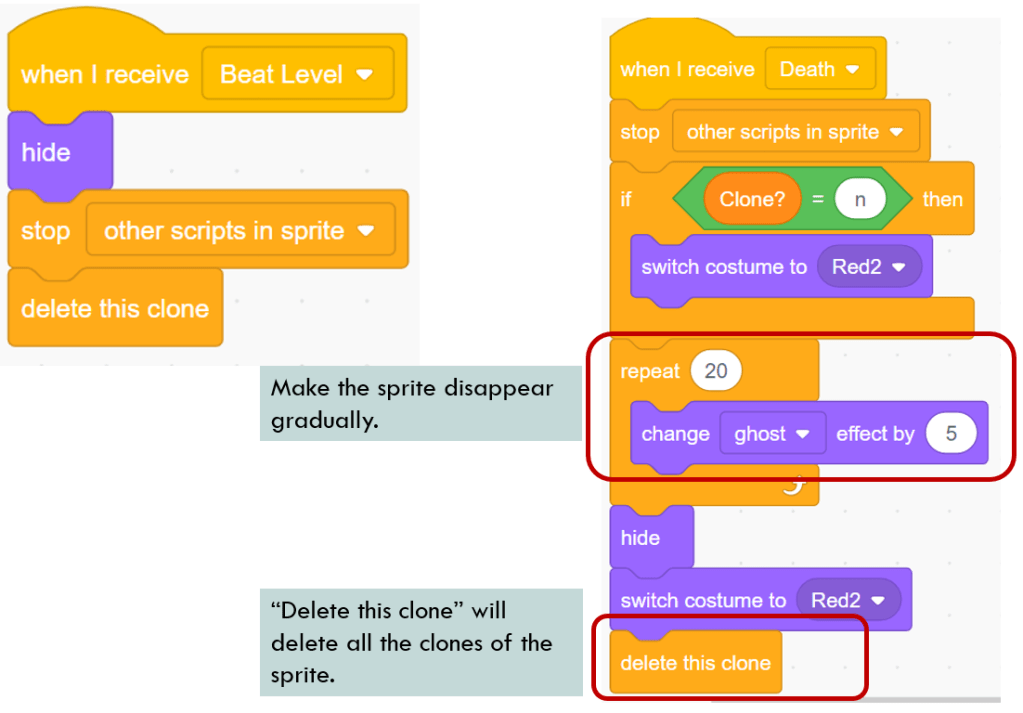 These two code segments are easy to understand. They just hide the sprite and delete all its clones when the user passes one level or invokes “Death” status.