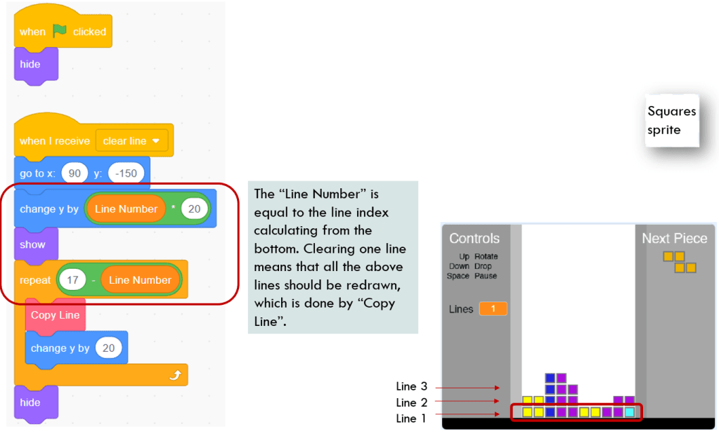 When Squares sprite receives “clear lines” message, how should it do to clear the line? Follow me to take a look below.