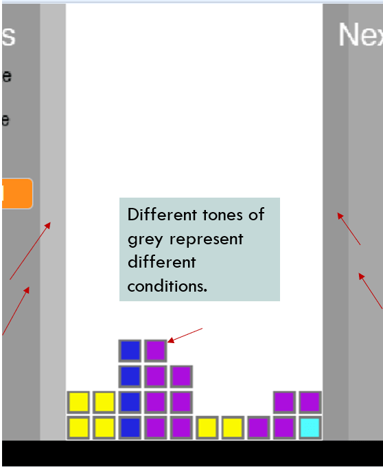 Another highlight of this game is that it uses different colors to trigger different judgement. In order to judge if the falling piece crosses the left or right boundary, the program designs four tones of gray, so that it could judge accurately which side the piece is crossing and how deep it crosses. It uses another tone of gray to judge if the falling piece touches the existing pieces. It uses black color to judge the bottom of the board.