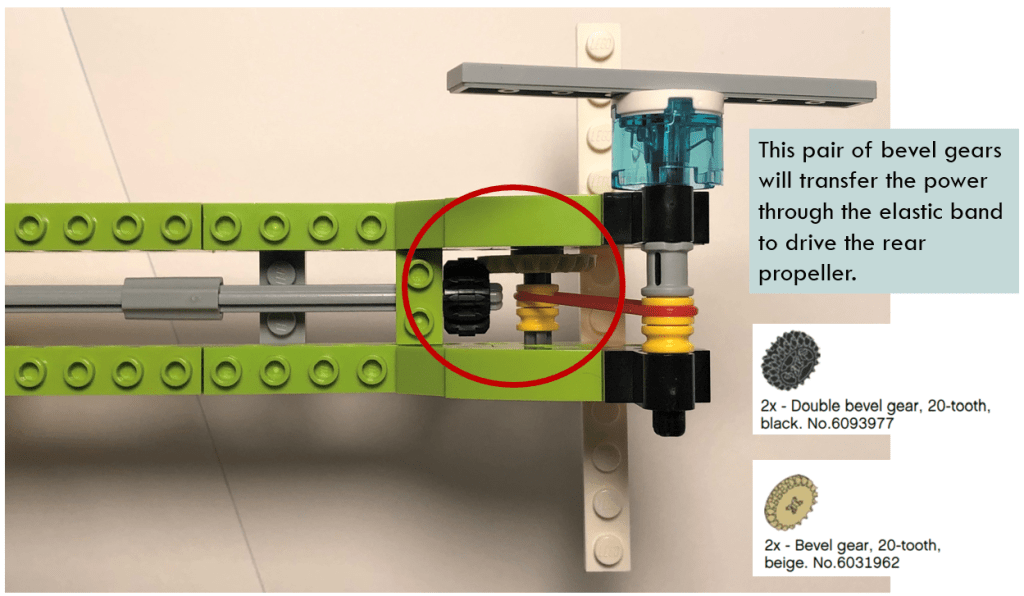 The long axle then connects to a pair of bevel gear to change the rotation direction. The output axle connects to a piece of elastic band to drive the rear propeller.