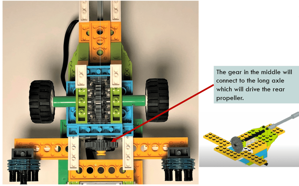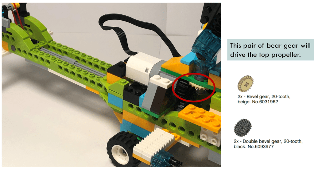 In the above section, I introduced the driving gear. Since it is a double bevel gear, it could pair with a yellow 20-tooth bevel gear in a perpendicular position and change the rotation direction. The output axle of the bevel gear then drives the top propeller.