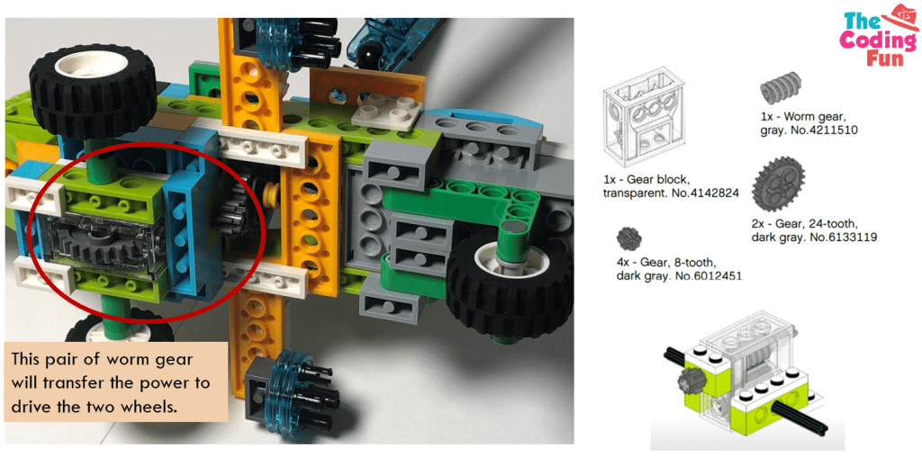 When I explained gear train in the above section, I mentioned that the 24-tooth gear transfers the rotation power to the rear propeller, while the 8-tooth gear, which is located at the lowest position of the gear train, connects to a gear worm in the transparent gear box (in red circle). The output gear of the gear box then drives the two wheels.