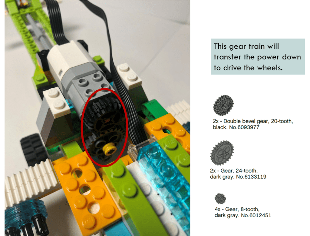 The gear train transfers the rotation power from the driving gear downward. The 24-tooth gear, which is located in the middle of gear train, connects to a long axle as show in the below illustration.