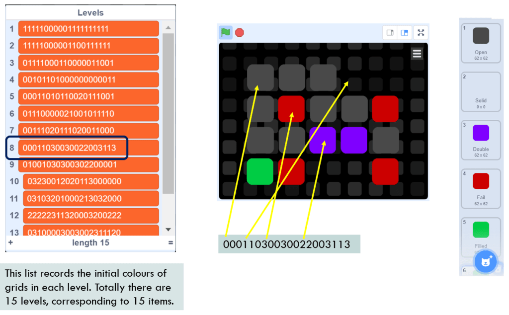 This list stores each tile’s costume information. Those costumes are what the tiles will use when the game level is initiated. If the tile’s costume changes from Open (gray color) to Filled (green color), or from Double (purple color) to Open, the data in the Levels list is not affected.
