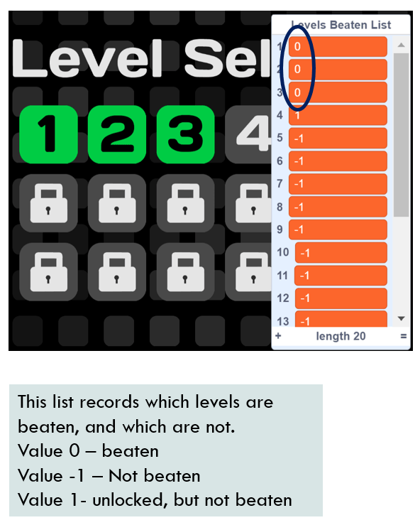 This list stores 15 items, corresponding to the 15 levels of game. If the level is beaten, its value is 0. If the value is not beaten, but unlocked, its value is 1. If the value is not beaten yet, its value is -1.