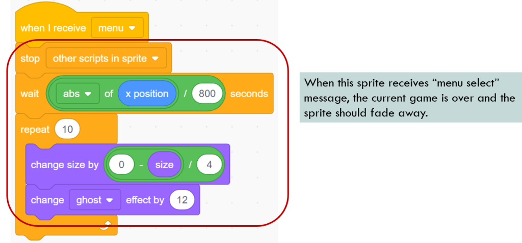 When the user clicks Menu sprite on the screen, Game sprite receives the message of “menu”. The Game sprite will stop running all of other code segments and then make itself fade away and finally disappear.
